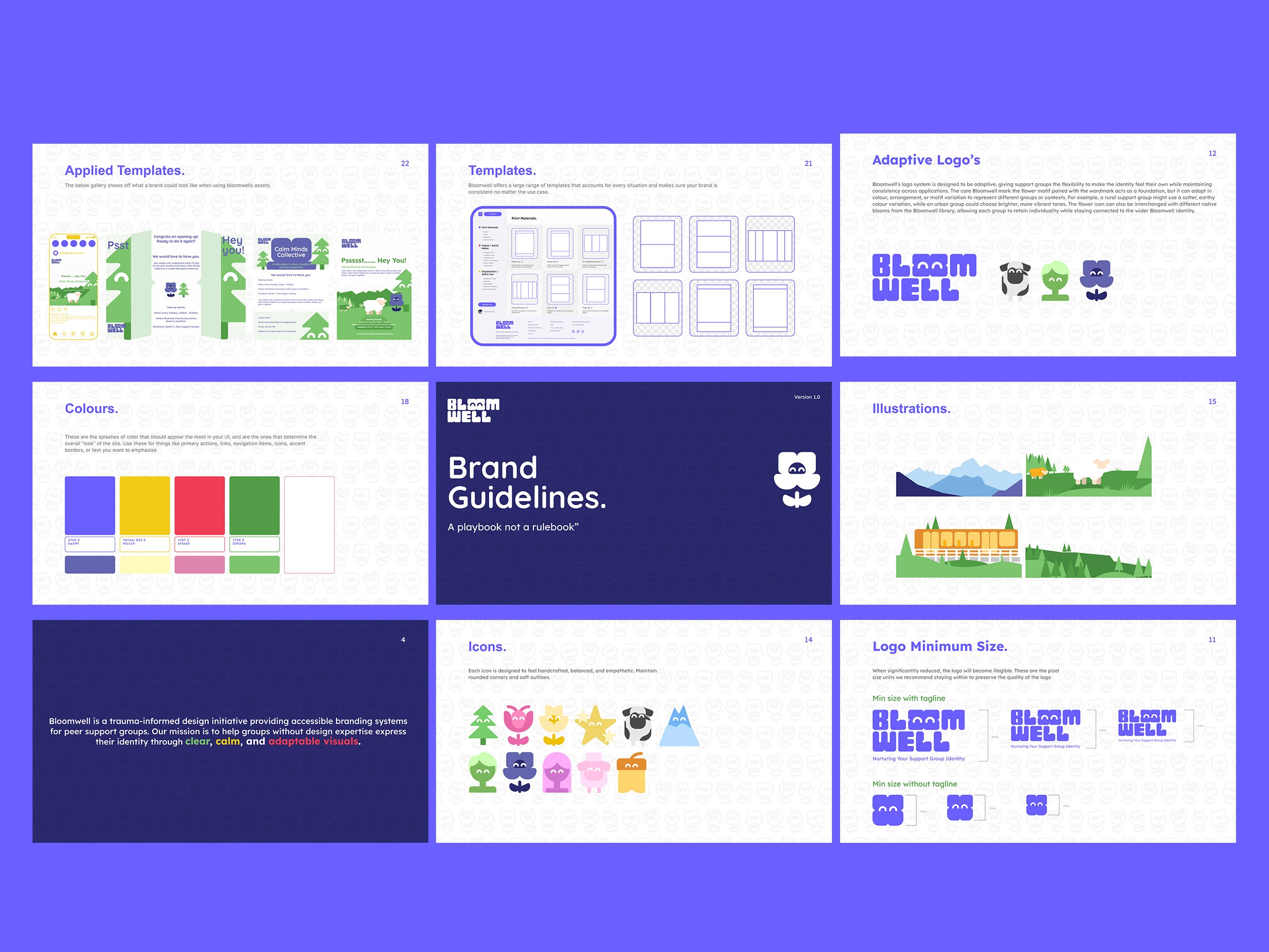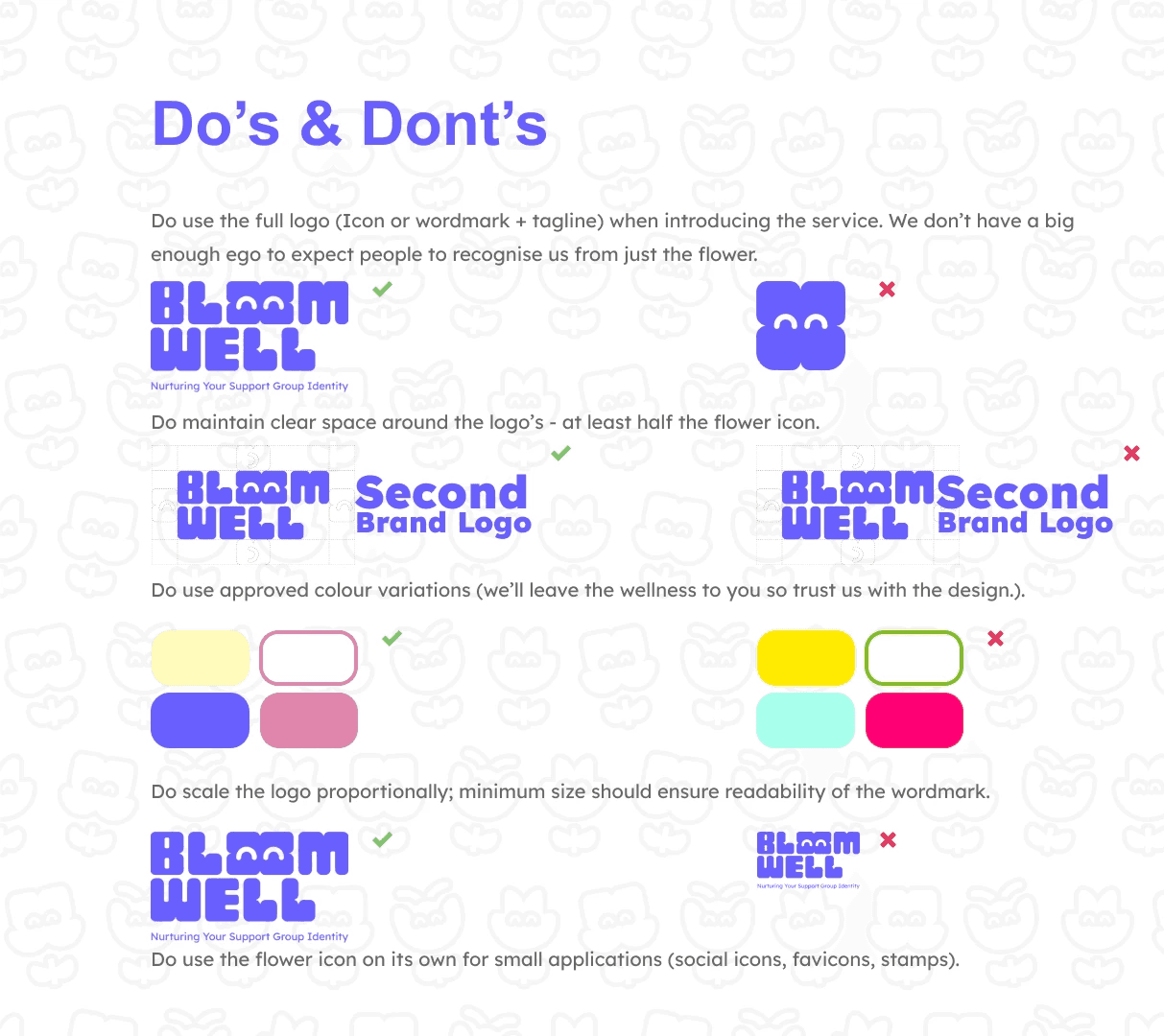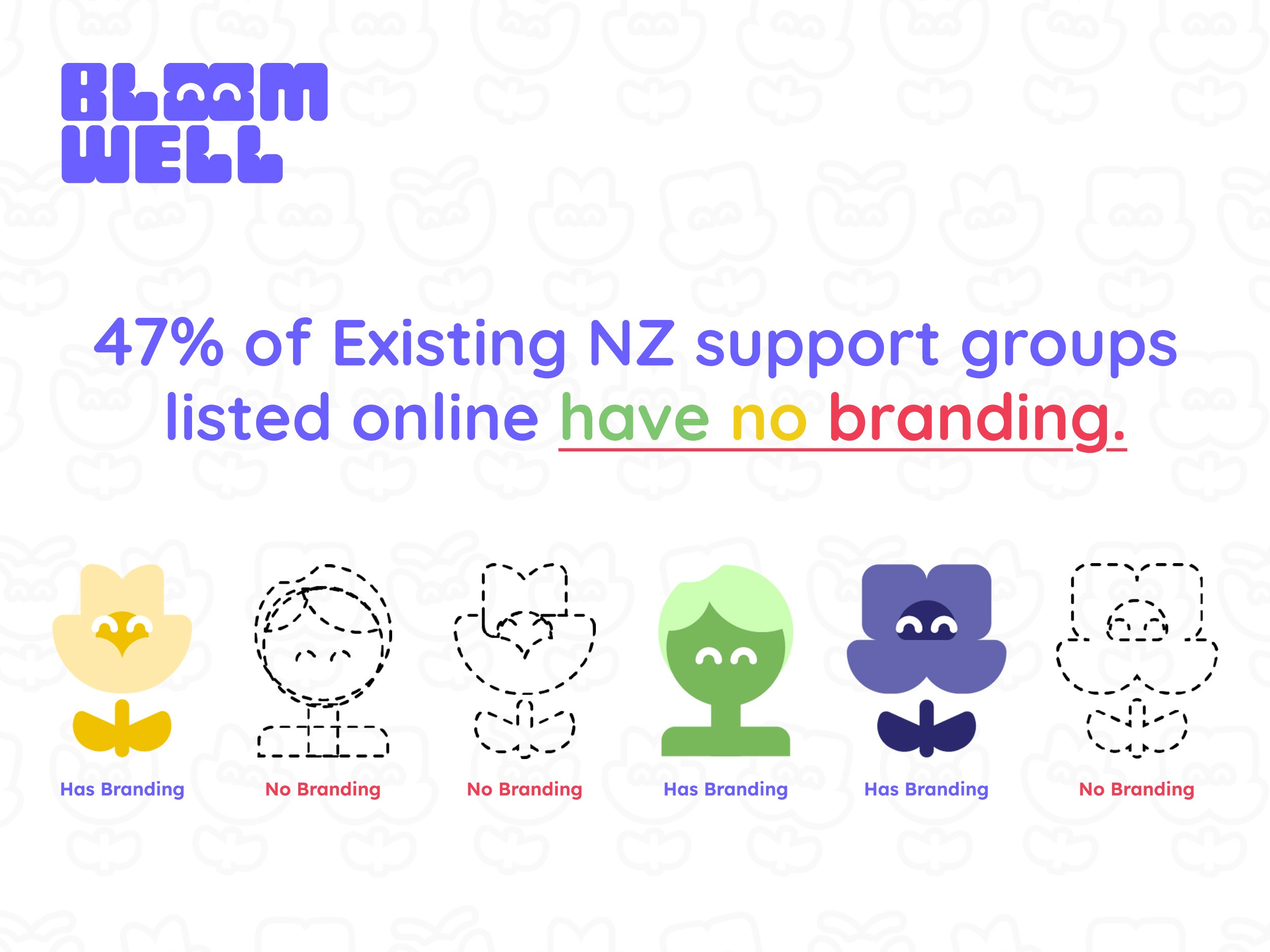 Alongside this qualitative insight, a survey of New Zealand’s online registered public support groups revealed a striking statistic: 47% of them had no branding at all. No logo, no colour, no visual consistency. This became the defining problem statement for Bloomwell and the visual metaphor of the project’s presentation: half-filled icons standing for the groups that are still unseen.