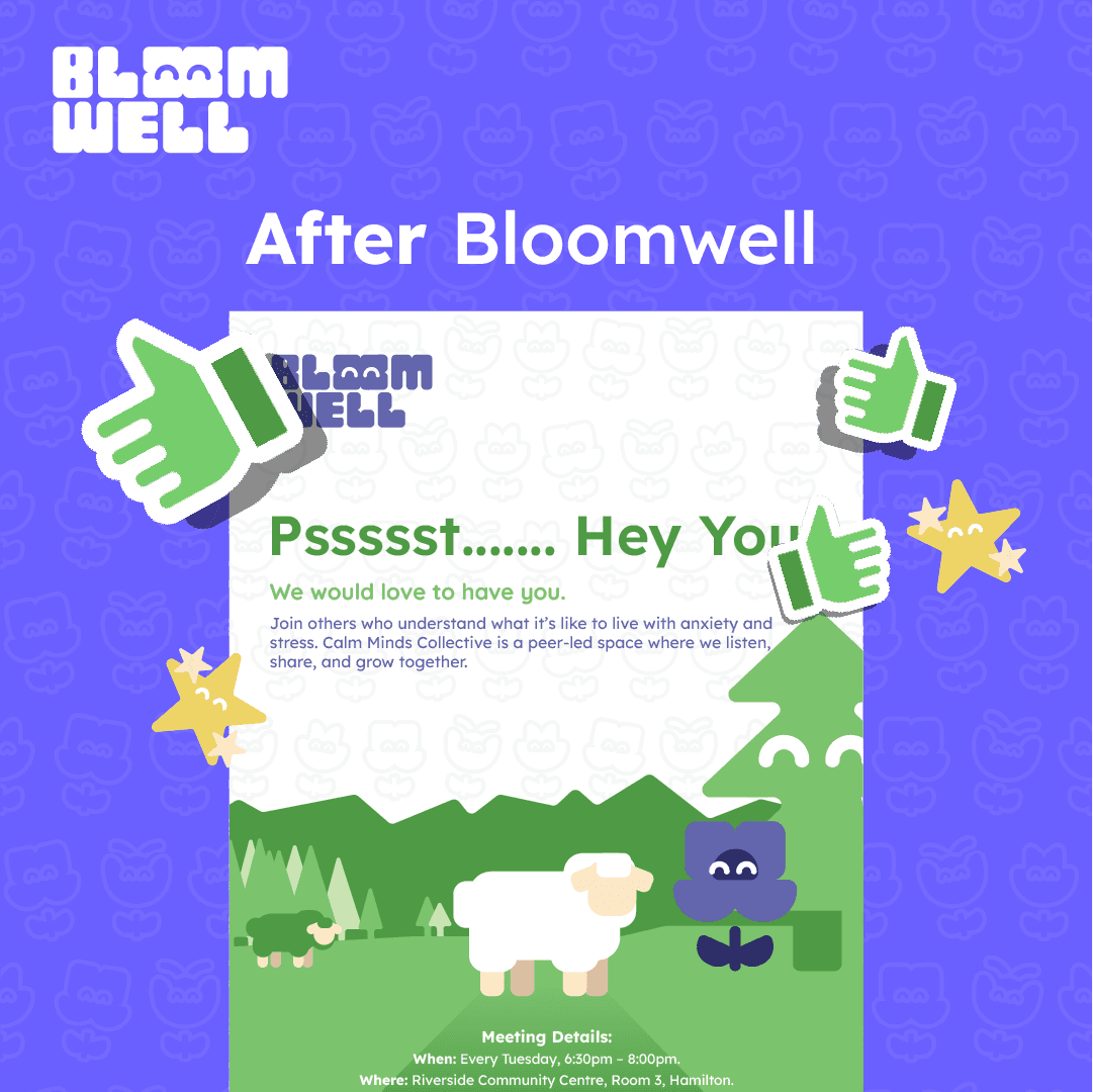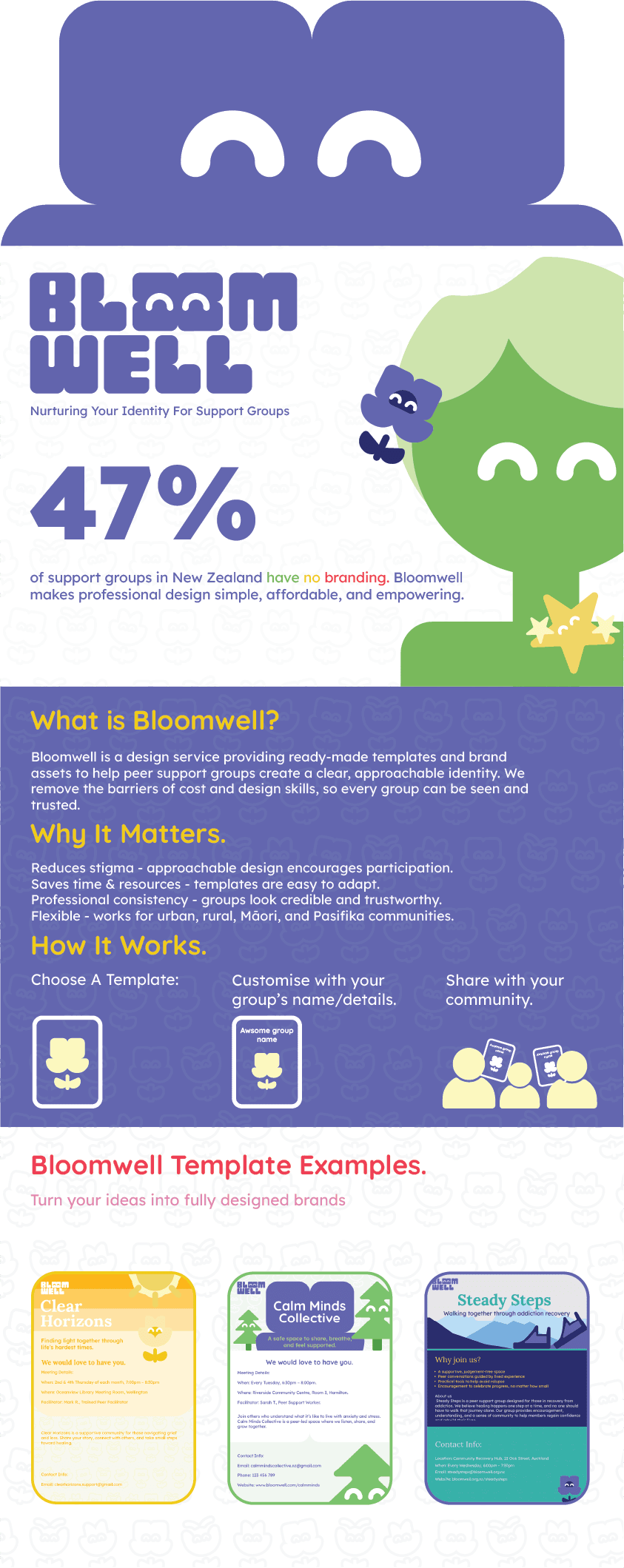 Across Aotearoa, hundreds of peer support groups work quietly in the background of communities providing connection, understanding, and hope for those navigating mental health challenges. Yet, while their work is deeply human, their presence often stays invisible. Many of these groups exist without clear visual identities, websites, or communication tools. Their messages of care are dampened by a lack of design resources.