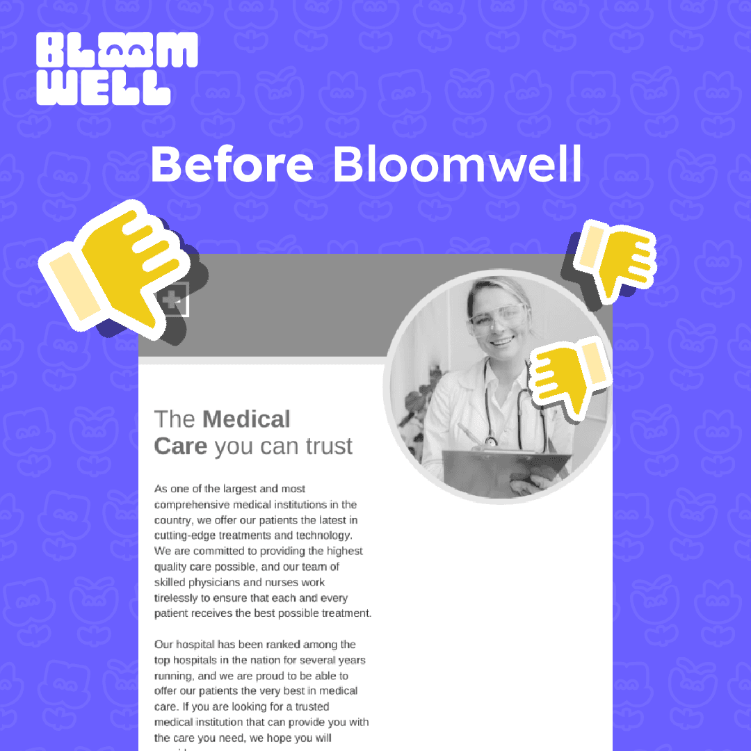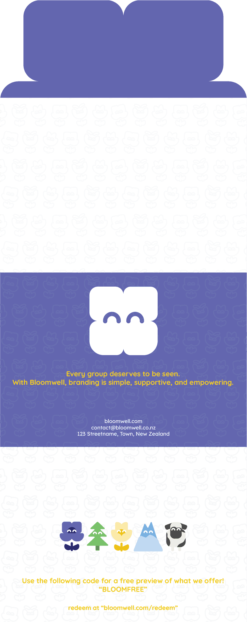The flyer serves as Bloomwell’s first point of contact explaining the purpose of the platform, the 47% problem, and showing before-and-after examples of branded versus unbranded groups. It’s concise, visually uplifting, and designed to be shared at conferences or mailed to local facilitators.