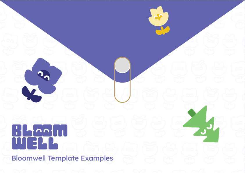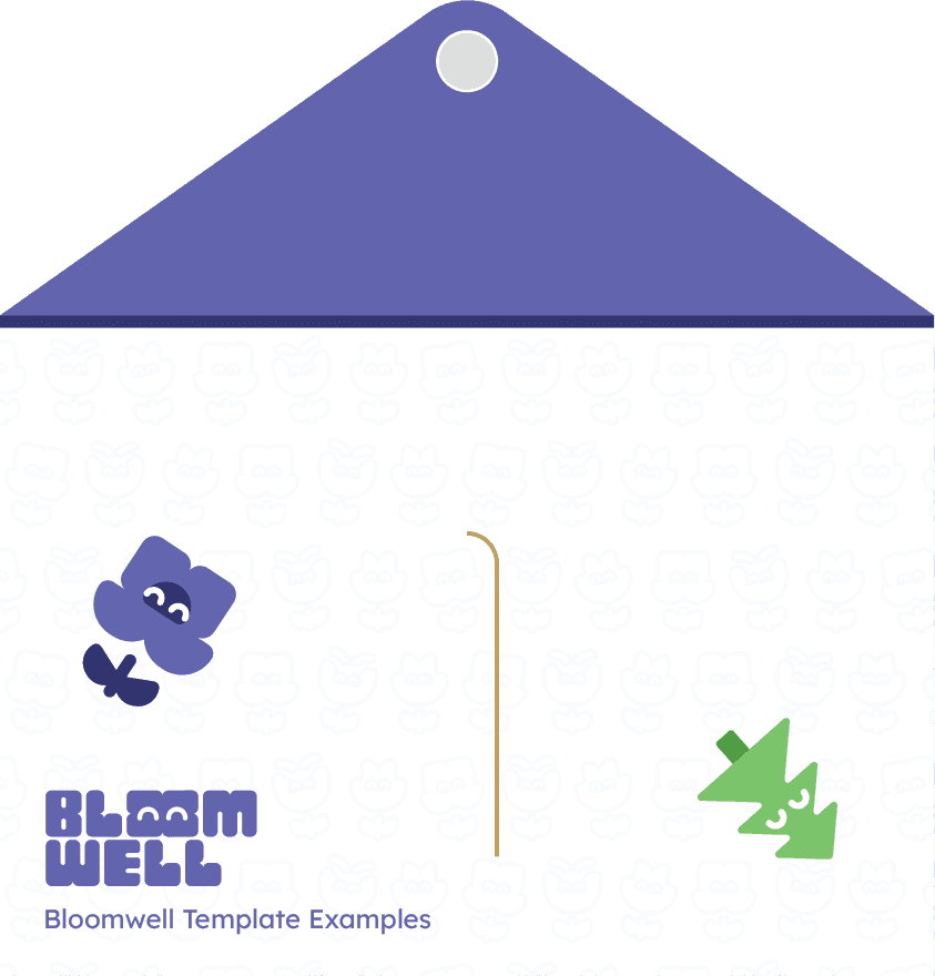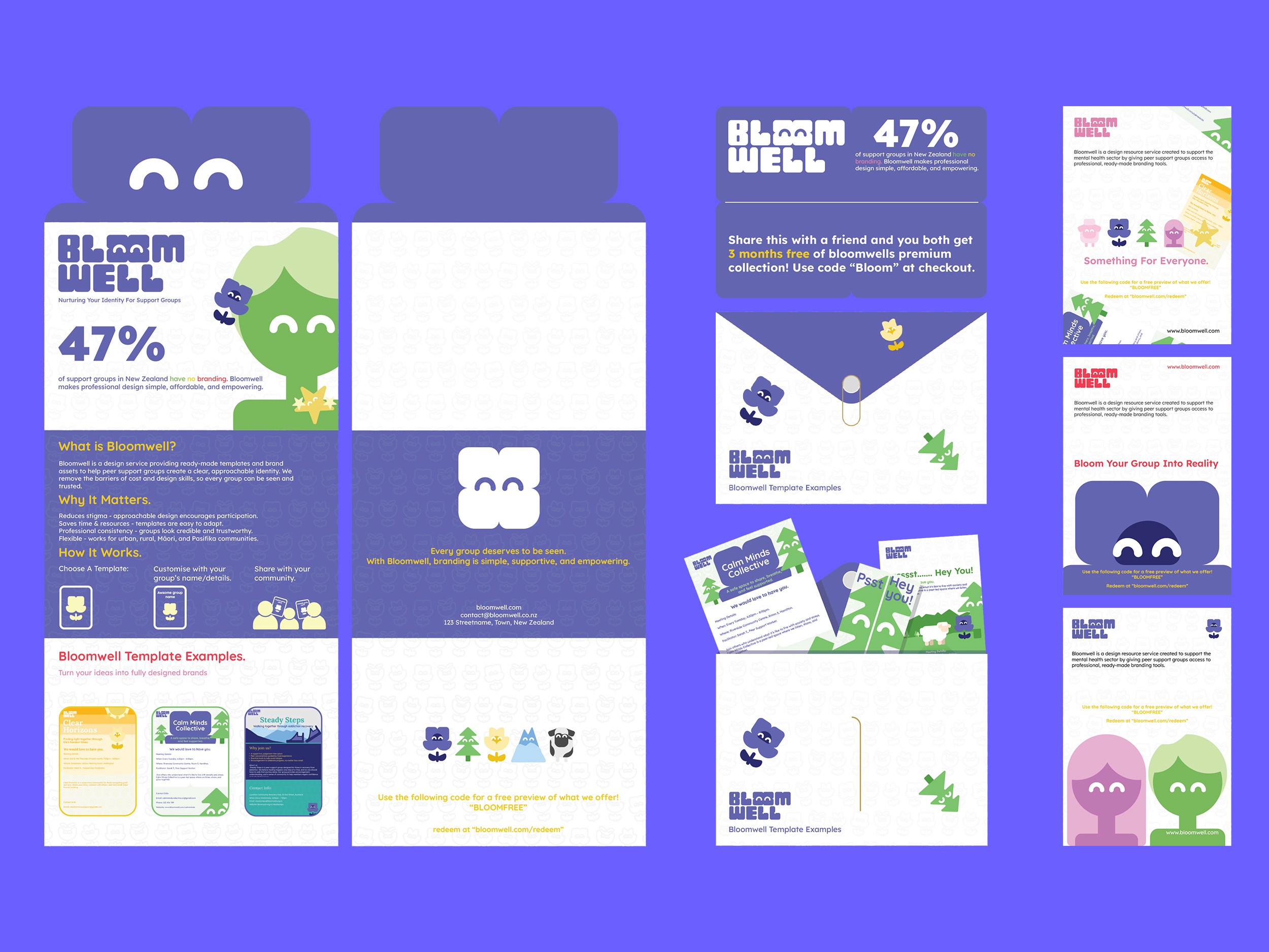 The third part of the package introduces an envelope containing printed examples of Bloomwell templates. By physically holding these designs, facilitators can see the difference a cohesive identity makes turning an abstract concept into a tangible sense of possibility.
